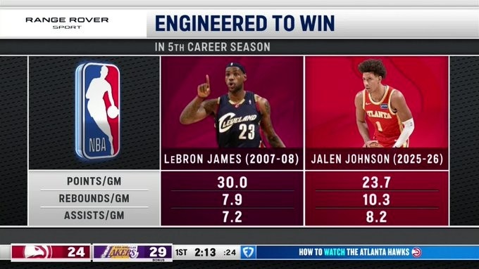 老鹰客场挑战湖人,转播方晒出杰伦·约翰逊和詹姆斯生涯第五个赛季的数据对比,老鹰官推转发。